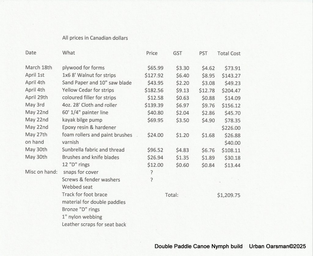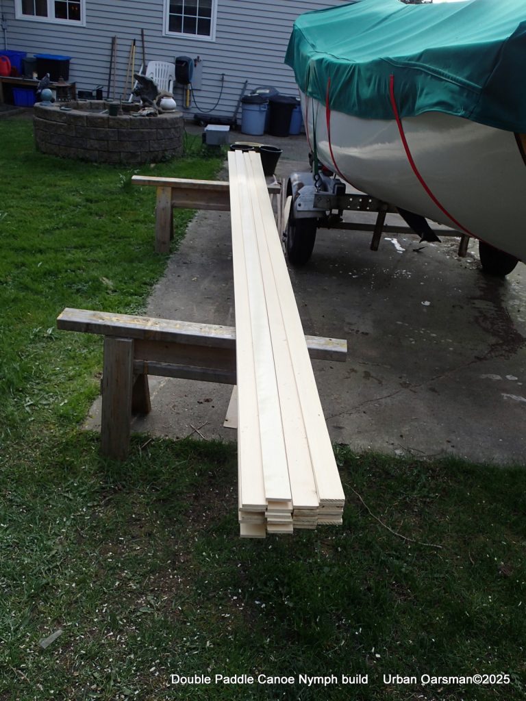 What I really need is a small, light, easy to transport boat to get out onto the water on at a moment’s notice. I have Nick Schade’s book “Building Strip-Planked Boats”. In the book there are the plans for a double-paddle canoe, “Nymph”. I was drawn to the design because of the tumblehome gunnel of the design. I took Nick’s advise and stretched the design out from 10′ (for 150 lbs) to 12’8″ to accomindate larger paddlers. (I figure that between myself and my stuff, its 225 lbs.) Even with this extra length, I should be able to get the canoe on and off of my roof racks and to the water without any problems.