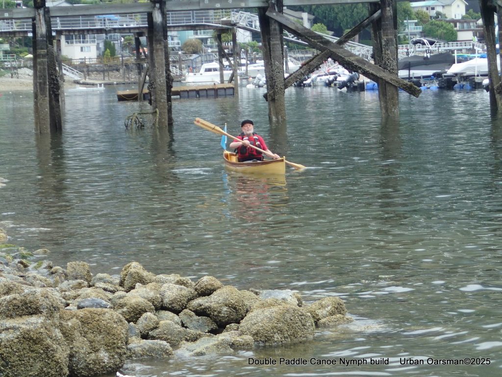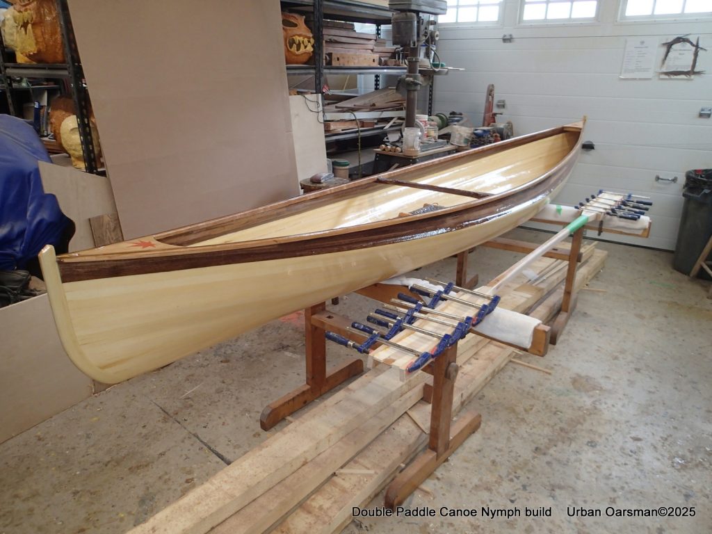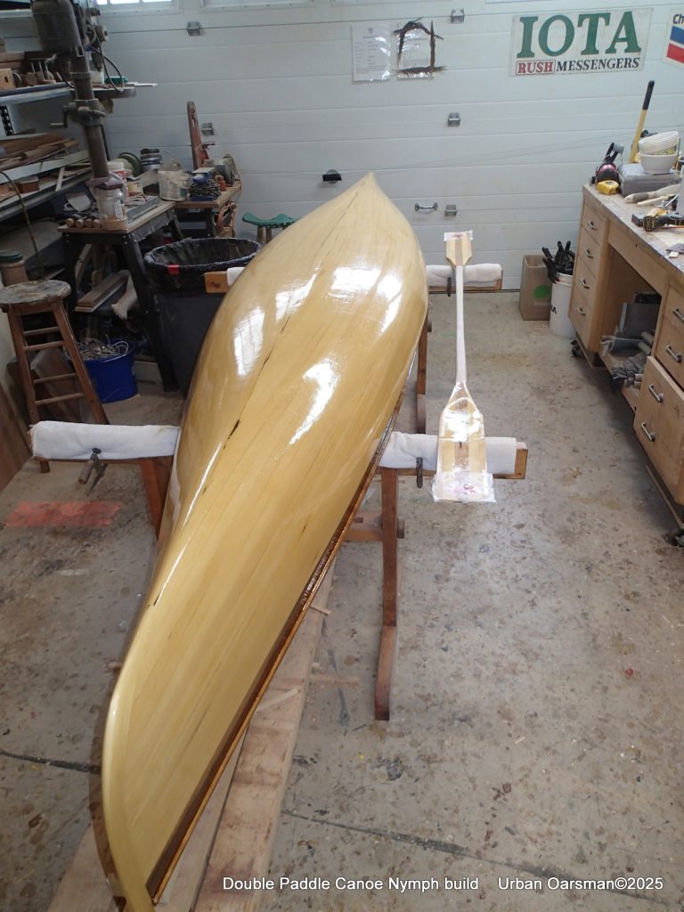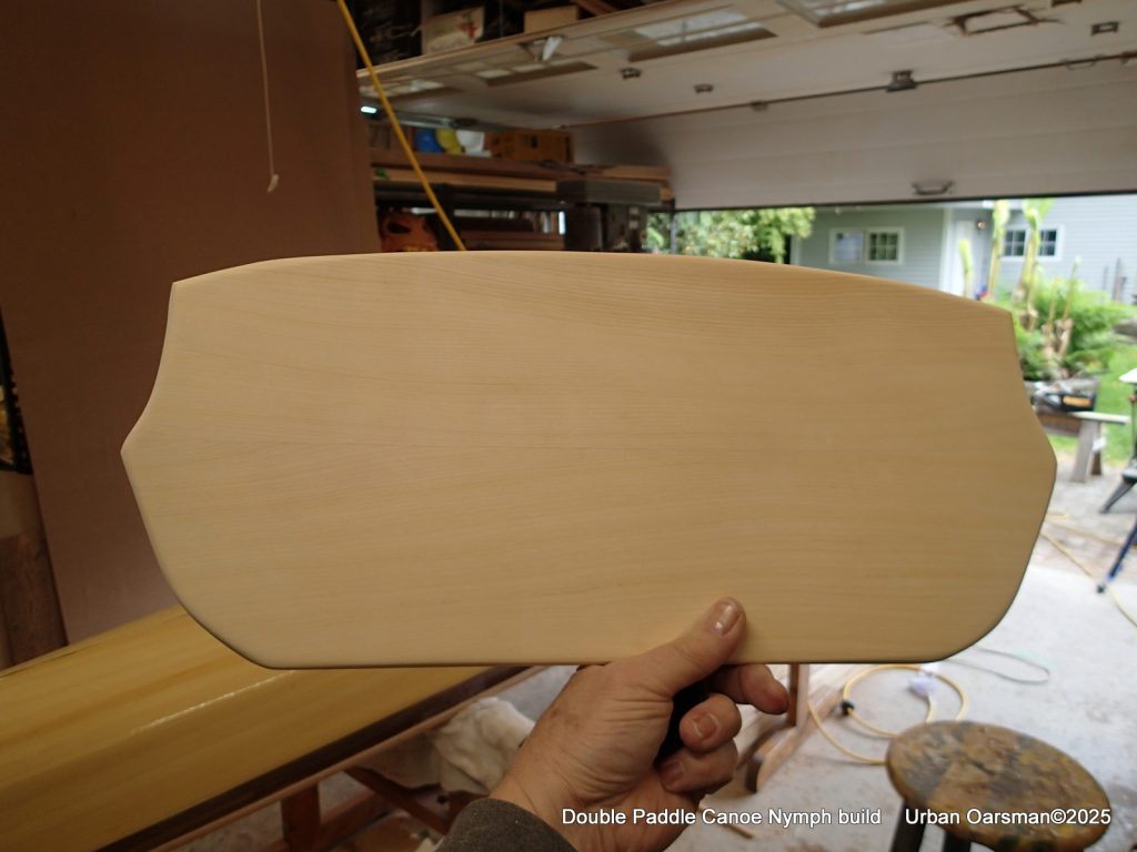 I am unsure as to how long my double paddle should be, so, while the varnish dries, between coats, I make a second longer double paddle to go with the double canoe.