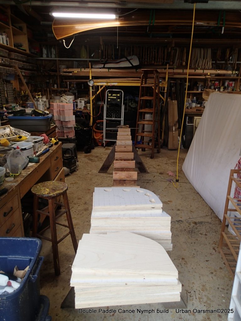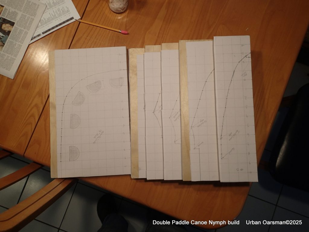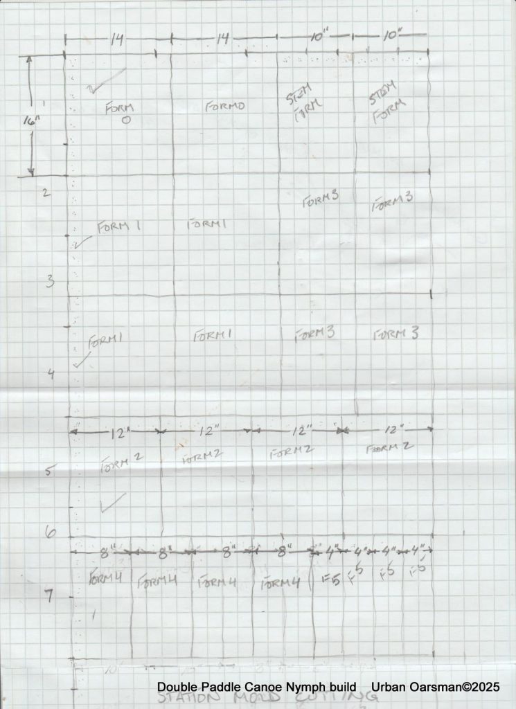 The plywood cutting plan for the forms. All out of one sheet. In the past, I have had a hard time getting both sides of a form (station mold) to be the same. I am trying something new, cutting out “half” forms to get both sides of the form the same. I will draw only one side of the form onto the plywood and cut the “half” forms out on the bandsaw and finish with my 10″ sanding disk. This way both sides of the form should be identical. I will fix two sides together to get each complete form. Both sides of the canoe are identical, so there will be one form #0 (centre form), two “form #1, #2, #3, #4 and #5”, and two stem forms.