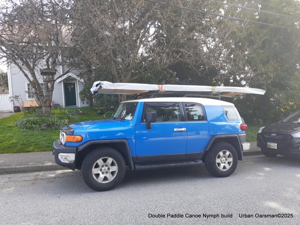 Bringing home yellow cedar and a walnut plank for the strips and for a double paddle or two.