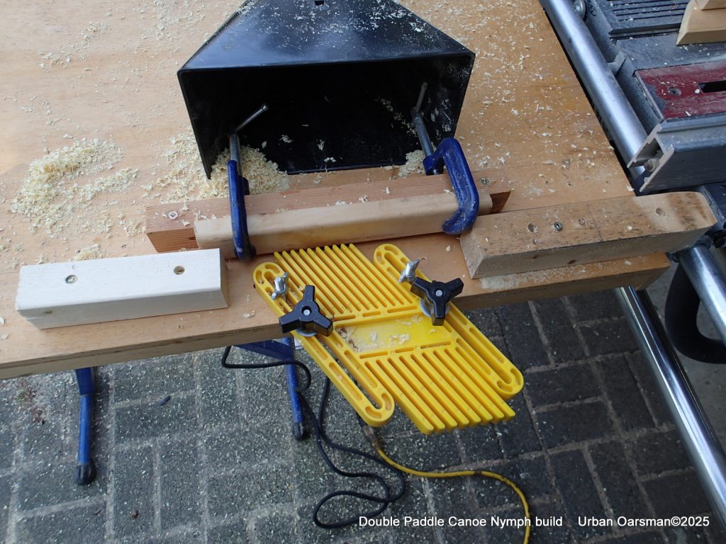 Test fitting the outer gunnels. Form #0 will keep the outer gunnels from distorting the hull shape. The ash gunnels need to be shaped and tapered. To do this, I have one gunnel proud at the bow and the other proud at the stern so I can fit both at the same time. Helps to keep things the same. My tapering jig and procedure is outlined below, in the fitting the inside gunnel part.