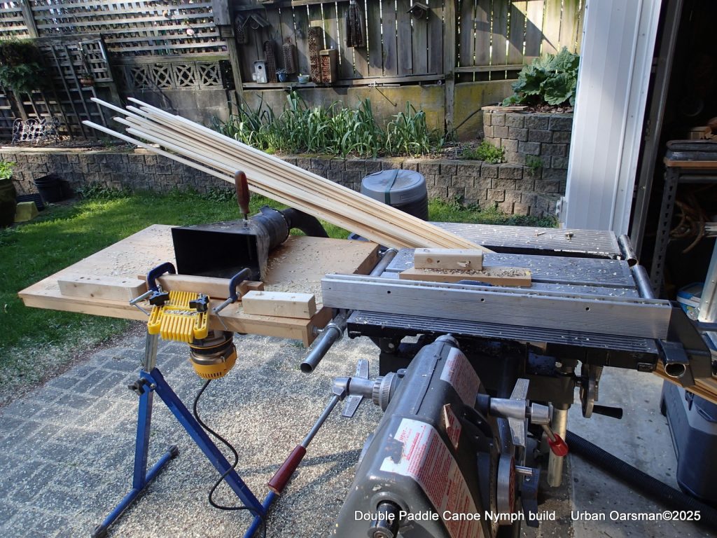 Having cut enough strips, time to plank. I ended up with over 45 gallons of wood chips and sawdust making the double paddle canoe.