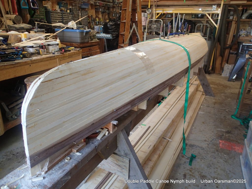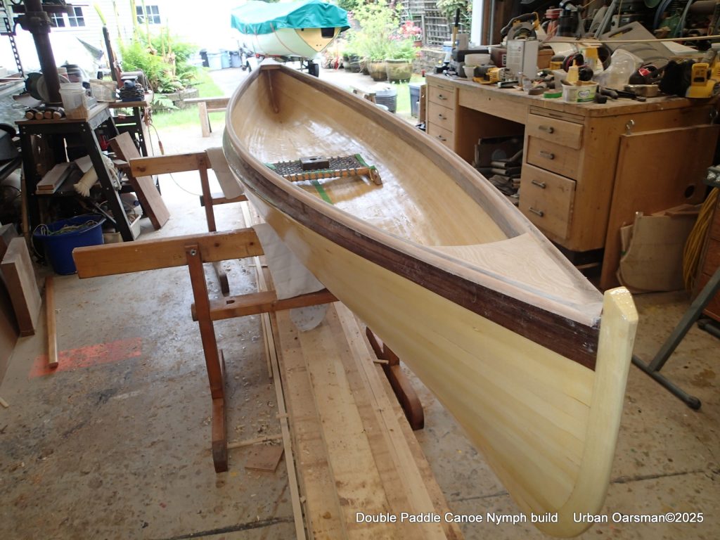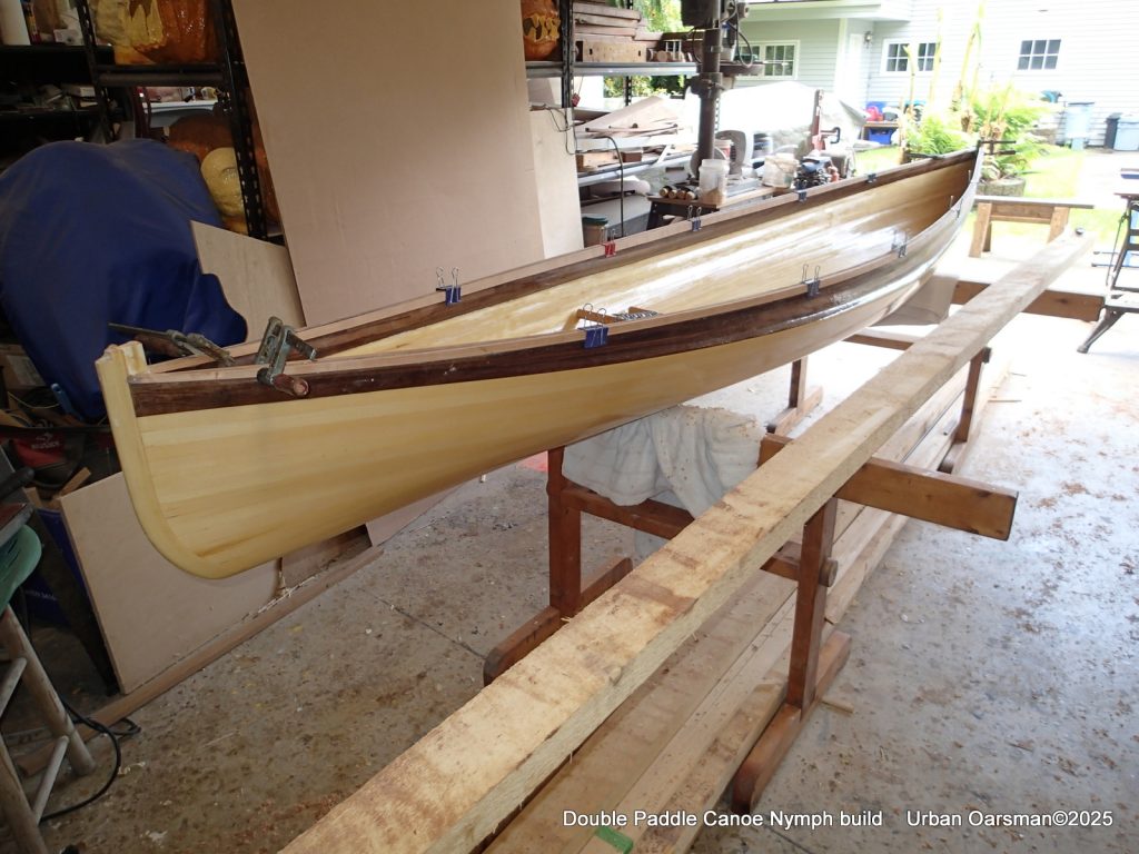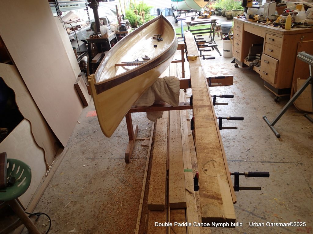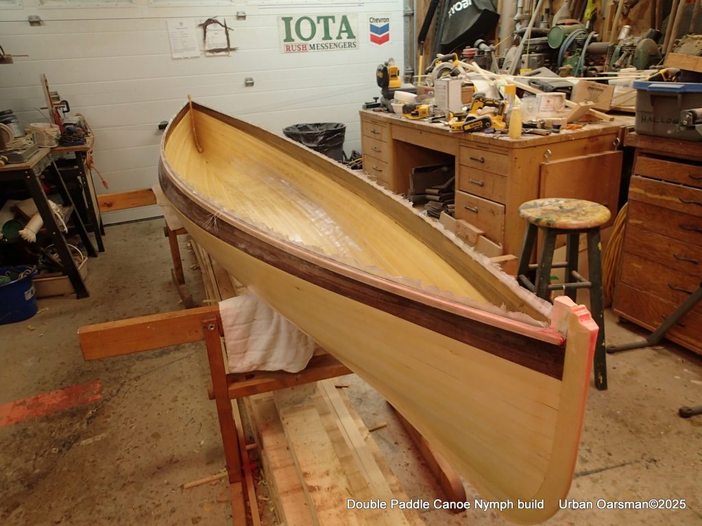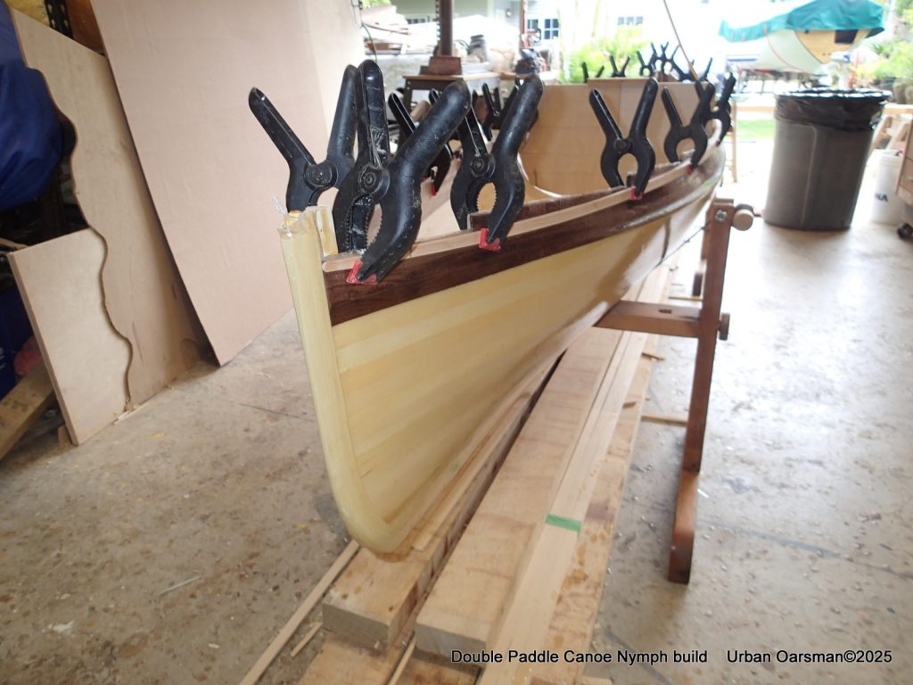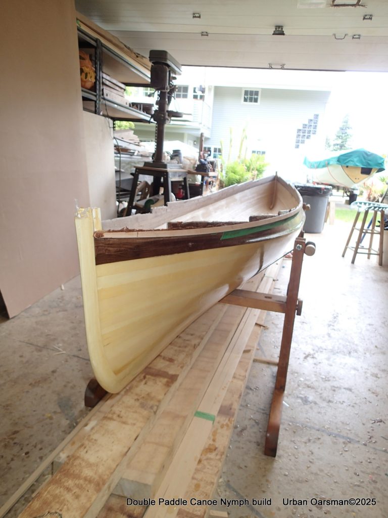 The tops of the gunnels will get a coat of epoxy and cloth…makes it easier to put the canoe onto roof racks without damaging the gunnels.