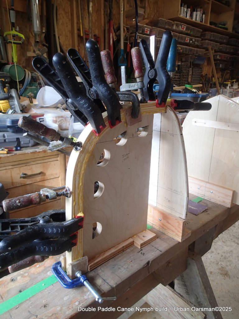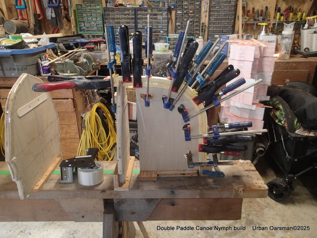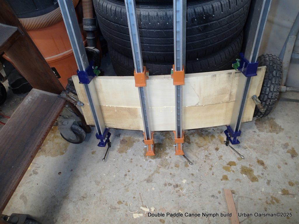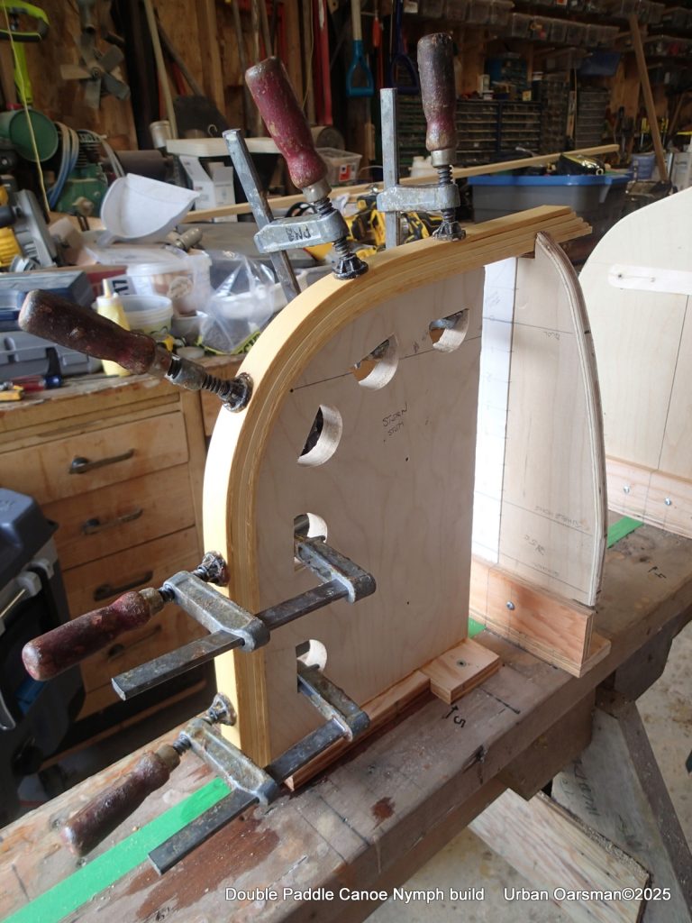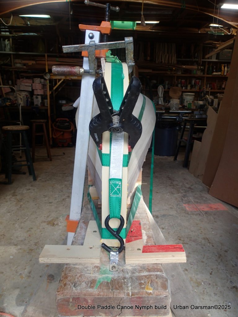 I modified my strong back for this part by putting a padeye at each end by the stems. To apply clamping pressure, I used ratchet straps to clamp the laminations to the stems. I also screwed in two pieces of scrap plywood to help keep the laminations aligned. Just to be sure, I threw in a long bar clamp where needed. Once the glue sets, there is no adjustment.