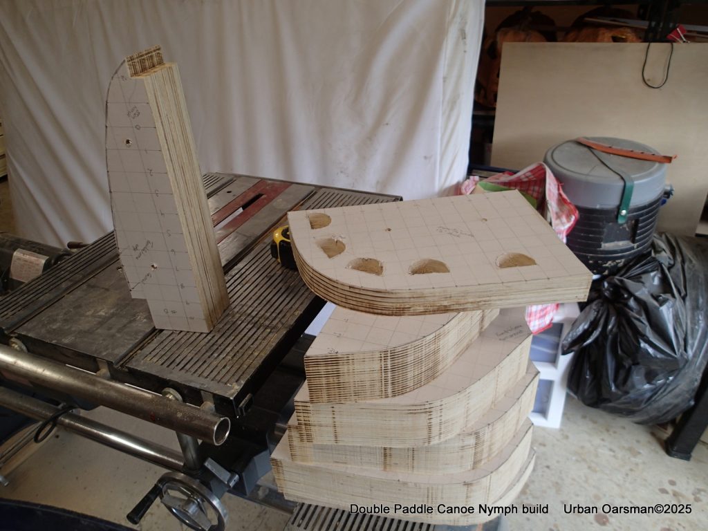 So I have cut out the forms on the bandsaw. There is a bow and a stern form, and four pieces each for forms #1, #2, #3, #4 and #5.