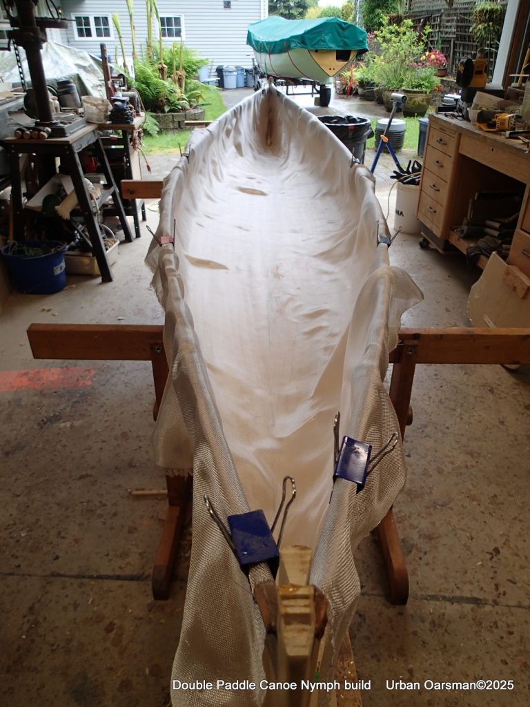 For a more stable work site, I took her off of the straps and put her on the solid wood sawhorse pieces. This way I can actually tie, strap, screw things to the sawhorses if I need to. I am using 4oz. cloth to keep the weight down. After the epoxy and cloth are done, I will install the inside gunnels. The 1″ bulldog clamps are really handy here. They are good for up to ¾” clamping thickness.