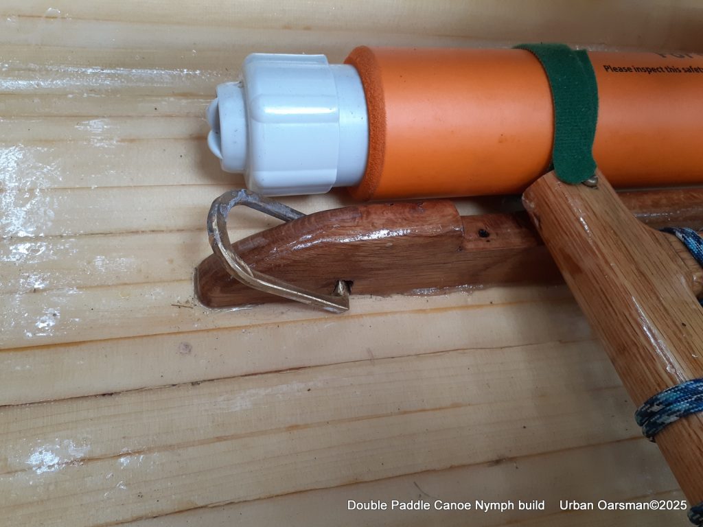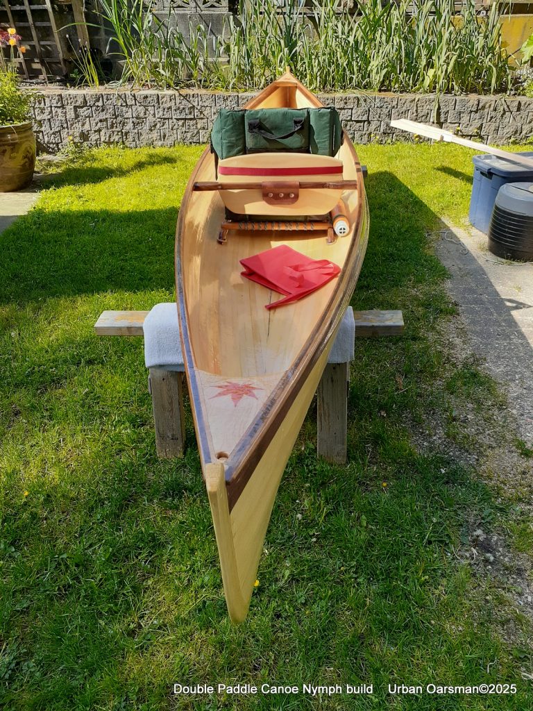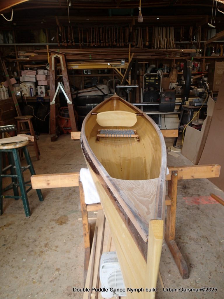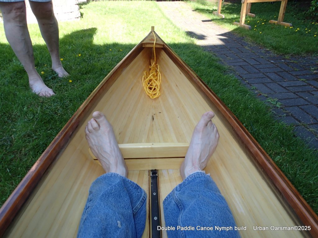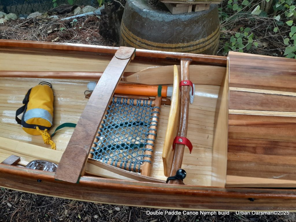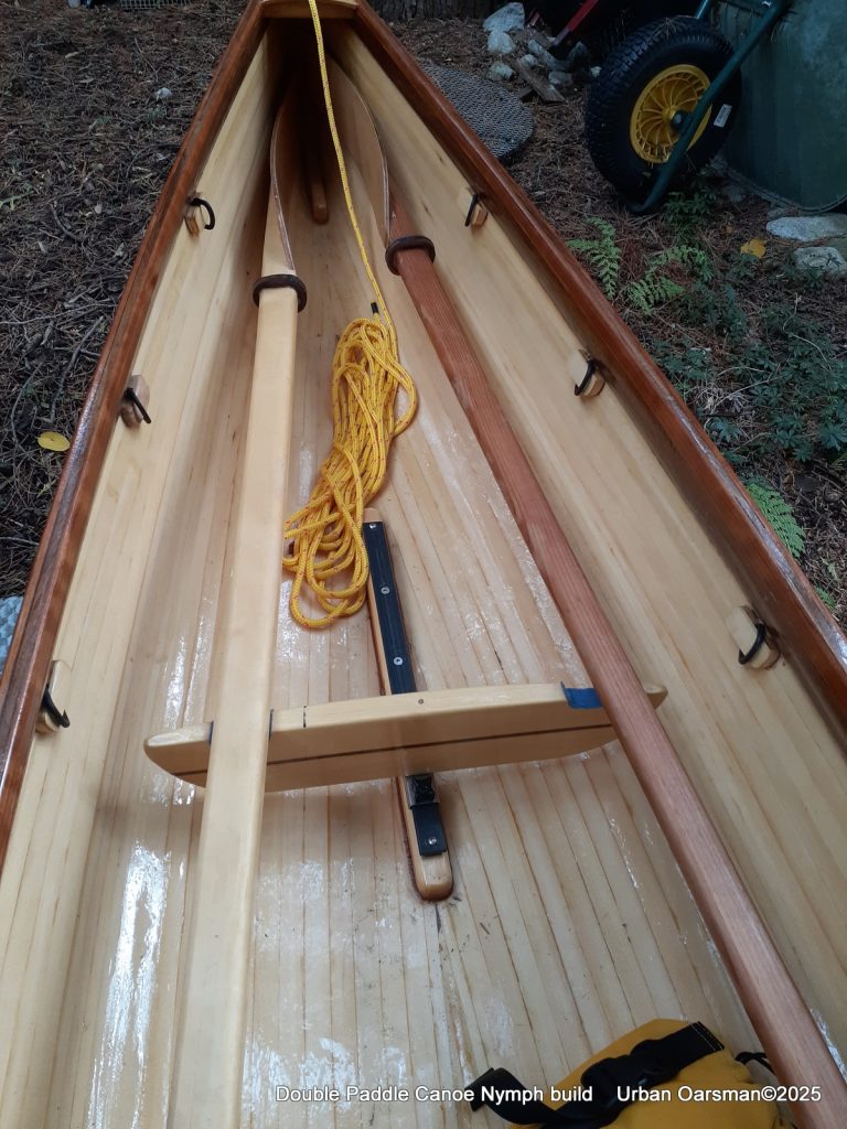 Off centre thwart installed. The seat base is from Paul’s canoe. He asked me to move the seats in the canoe to make it more comfortable for paddling. I had two cane seats and used them in Paul’s canoe. I am using his old seat here. It is screwed into two runners epoxied to the floor of the canoe. I have also put in four “D” rings to tie stuff to.