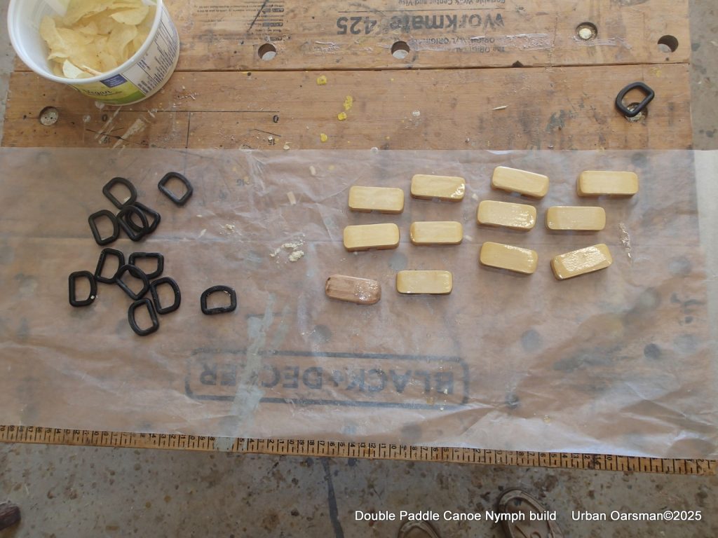 I do not think that you can have enough tie-downs, so I made up a dozen more for the canoe. As the “D” rings are plastic, they are not meant for a big load. I will thread shock cord through them to keep stuff in the canoe. It is also Potato chip snack time.