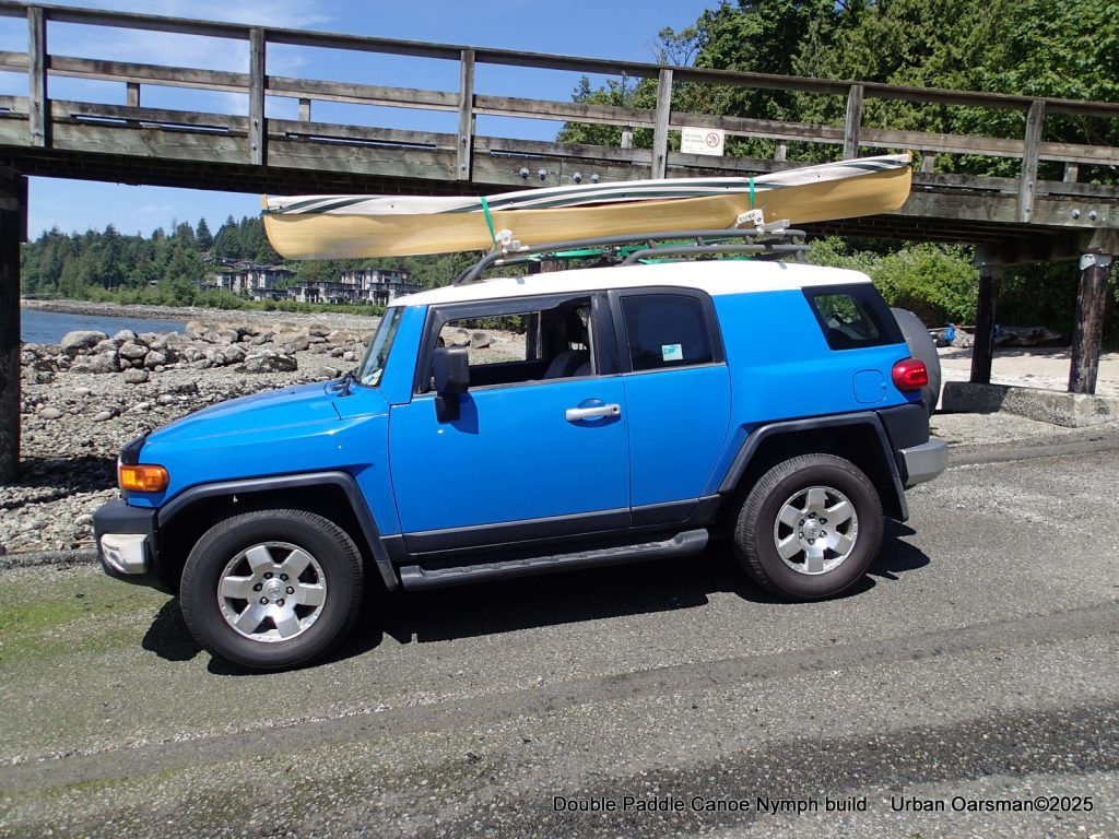 Apricity is easy to get up onto the roof rack. Here she has her cover on. By using the custom-fit saddles, I do not need a bow and stern line to tie to the FJ. Conditions here were unfavorable for a trial paddle. Ended up going to Deep Cove for the test paddle.