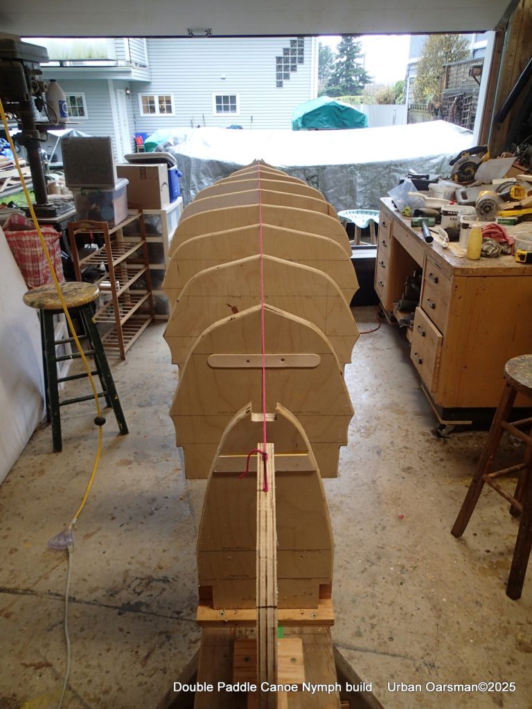 So here we are, the forms are in, aligned and ready for the bow and stern stems to be laminated in. If I was to do this again, I would make the forms go higher from the strong back to make access to the interior and the removal of the forms, when planked, easier.