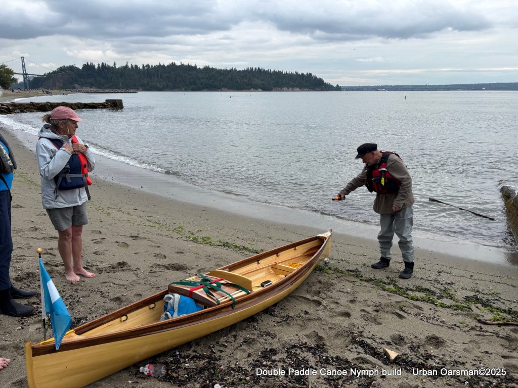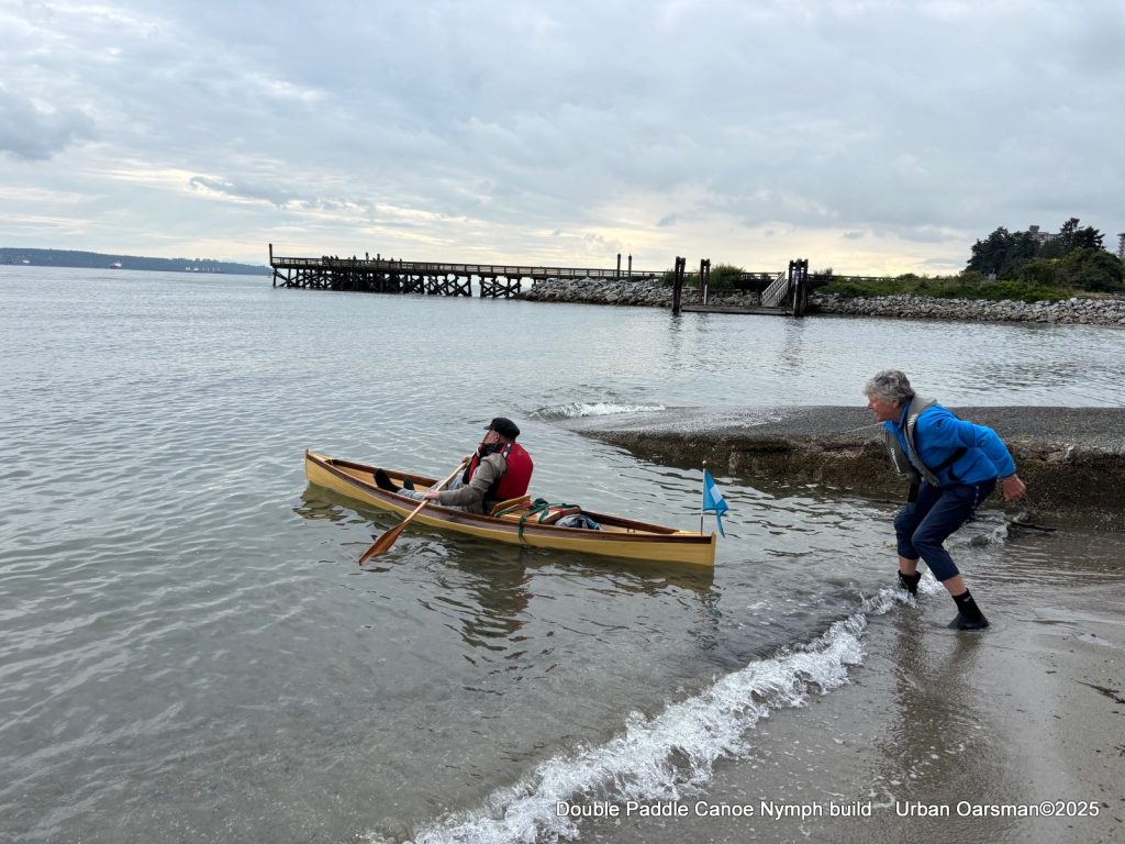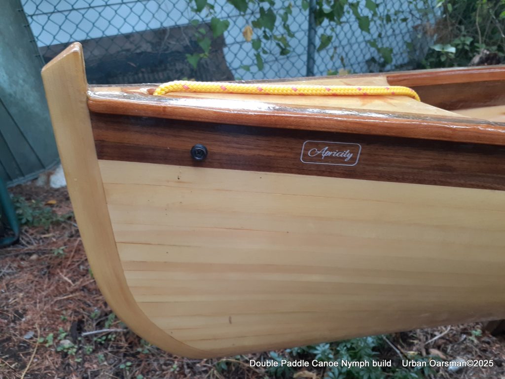 My double paddle canoe is named “Apricity” which is a word for the warmth of the sun in winter. You can see one of the snap button bases for her cover. She ended up being about 32lbs, Length:12’8” Width: 26½” at the tumblehome, 25½” at the gunnel, Depth: 10”. I credit her extra weight to using ¼” strips instead of ⅛”strips. I do not have and could not find ⅛” bead and cove router bits. Nick just butts the two strips together. I was not happy with that construction.