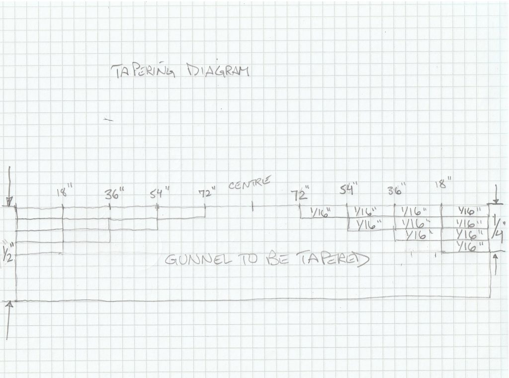 To the right of the hull is the plank that I used to make the gunnel tapers. I used my power planer to plane off 1/16″ every 18″ or so to create a taper. To do this, starting at one end, you mark the gunnel every 18″ and create a centre to the strip. Starting at each end, you plane 1/16″ off from the 18″ mark to the end of the strip. You then go to the second 18″ mark (36″ in) and plane to the end of the strip. So now you have tapered the strip 1/16″ at the second mark and 1/8″ at the first mark. If you plane from the third 18″ mark, you end up with a taper from the third mark of 1/16″, 1/8′ inch at the second mark and 3/16″ at the first mark. It is sorta like a series of steps you plane out. Please see diagram below: