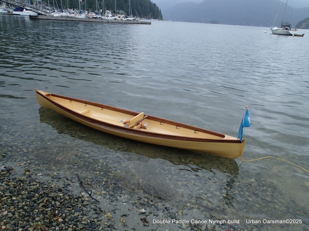 My double paddle canoe is named “Apricity” which is a word for the warmth of the sun in winter. You can see one of the snap button bases for her cover. She ended up being about 32lbs, Length: 12’8” Width: 26½” at the tumblehome, 25½” at the gunnel, Depth: 10”. I credit her extra weight to using ¼” strips instead of ⅛”strips. I do not have and could not find ⅛” bead and cove router bits. Nick just butts the two strips together. I was not happy with that construction.
